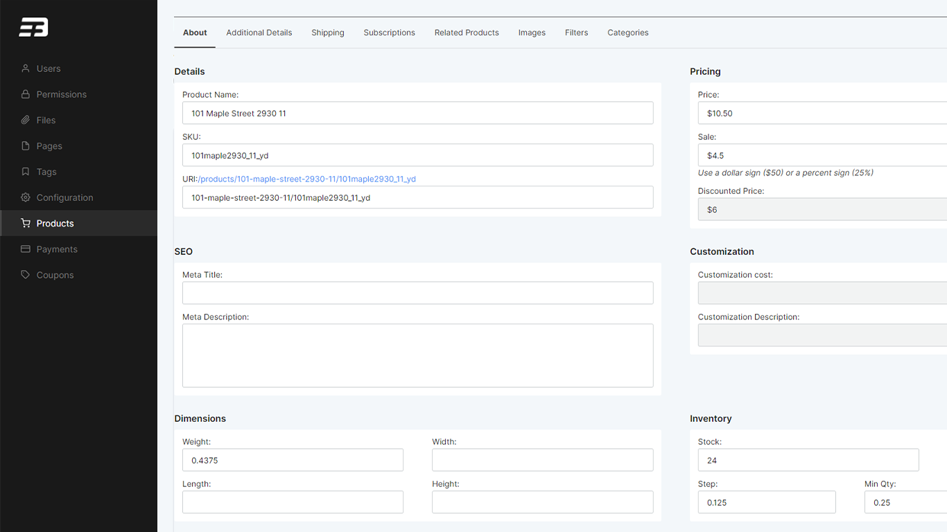 We offer the ability to sell in increments of a yard, being able to adjust units (1/8, 1/4, 1/2) and set minimum order requirements. For example, only having 3/4 of a yard remaining in stock.
