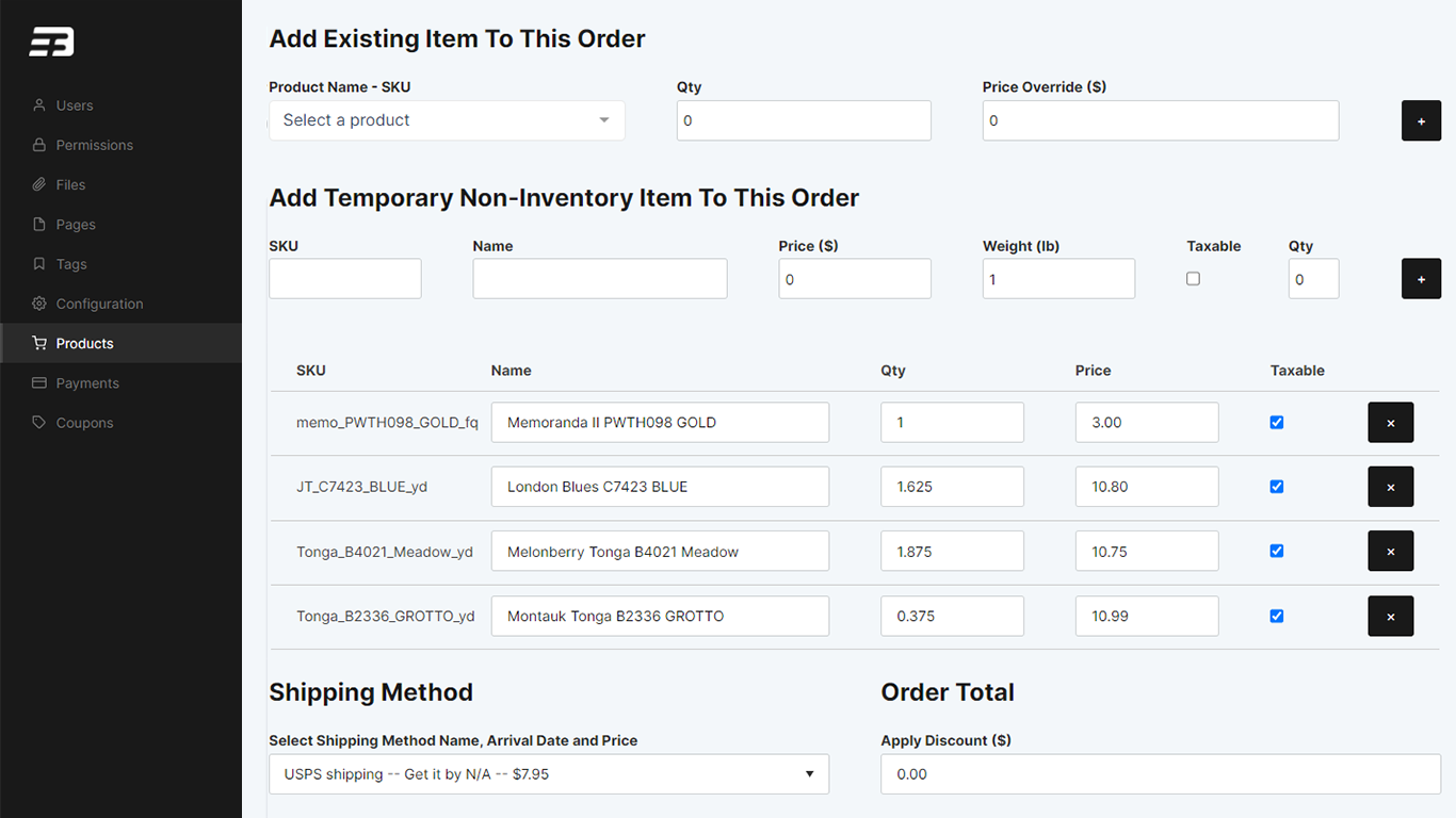 Have the accessibility to mark an item down, increase yardage and add items not shown on your website. Easily integrate with your USPS, UPS, or FedEx shipping accounts, or can be setup with custom rules.